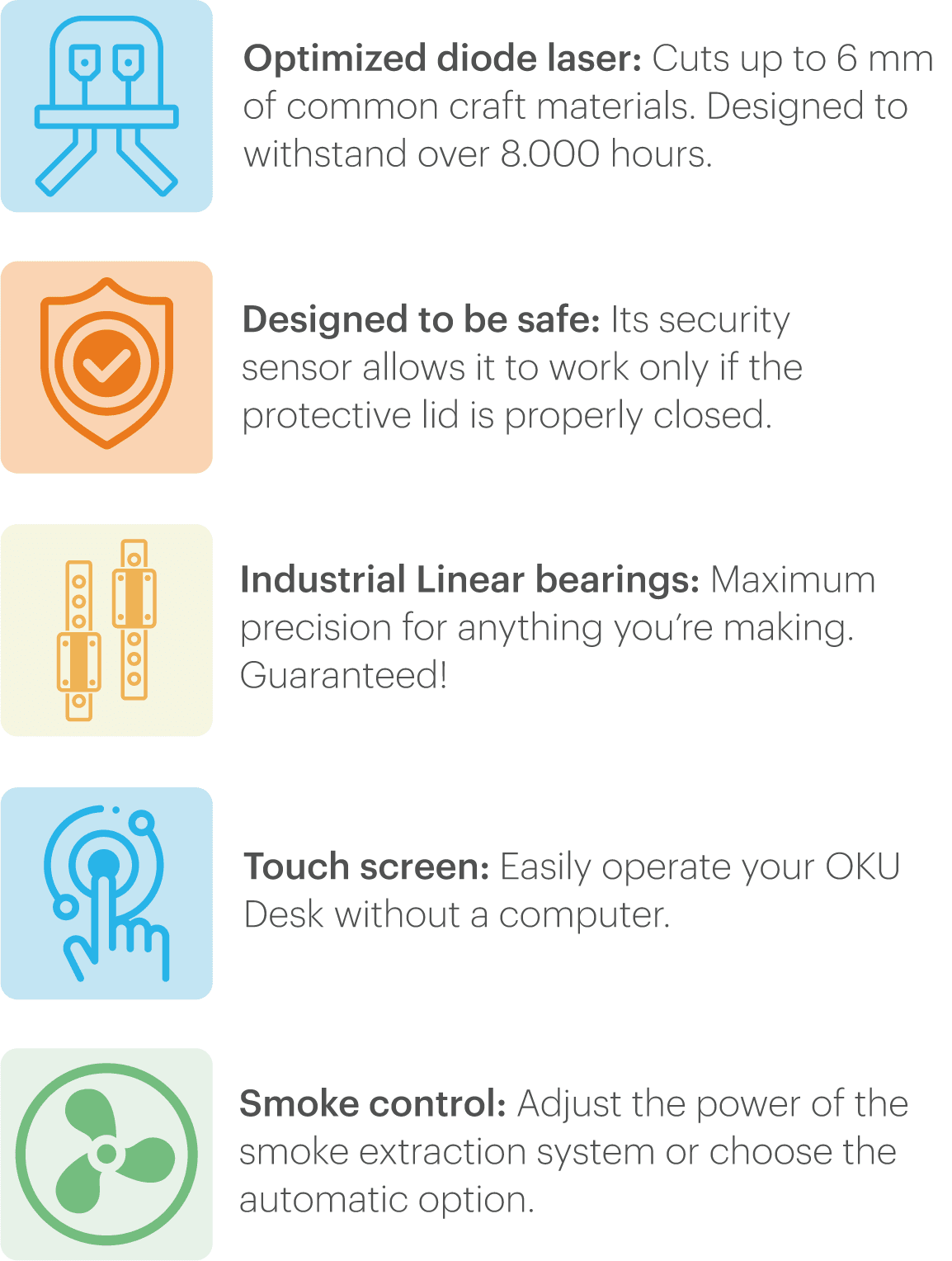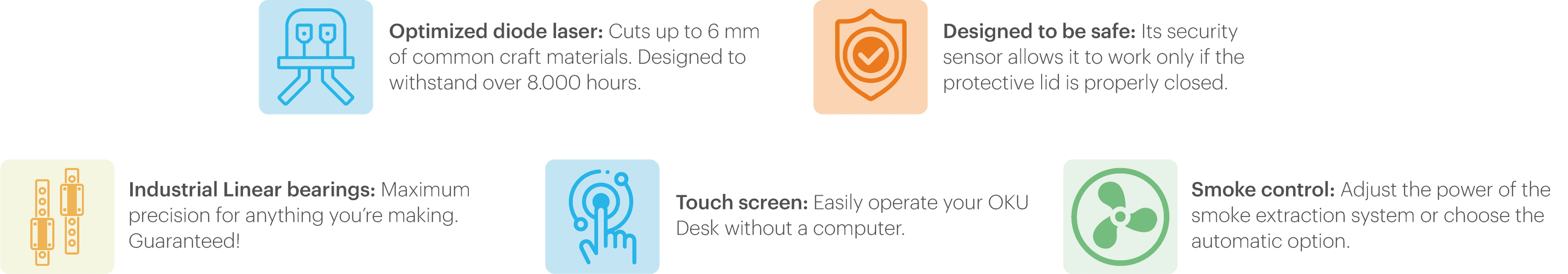 The OKU Desk uses industrial linear bearings to ensure the maximum precision (± 0,1 mm to be specific) on all your projects.